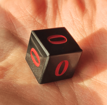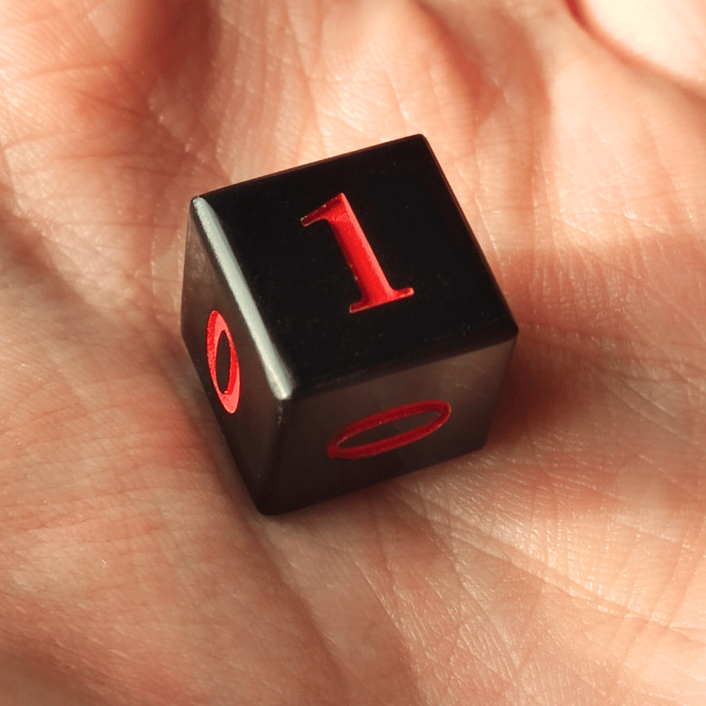 5 faces du dés sont remplacées par le chiffre 0, et 1 face par le chiffre 1.