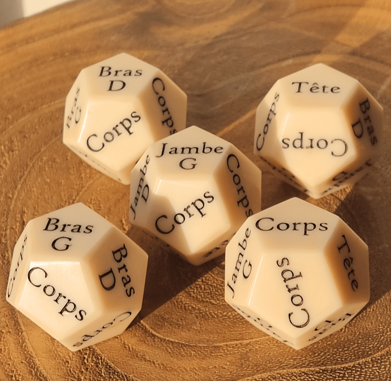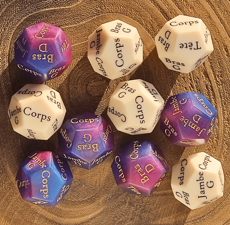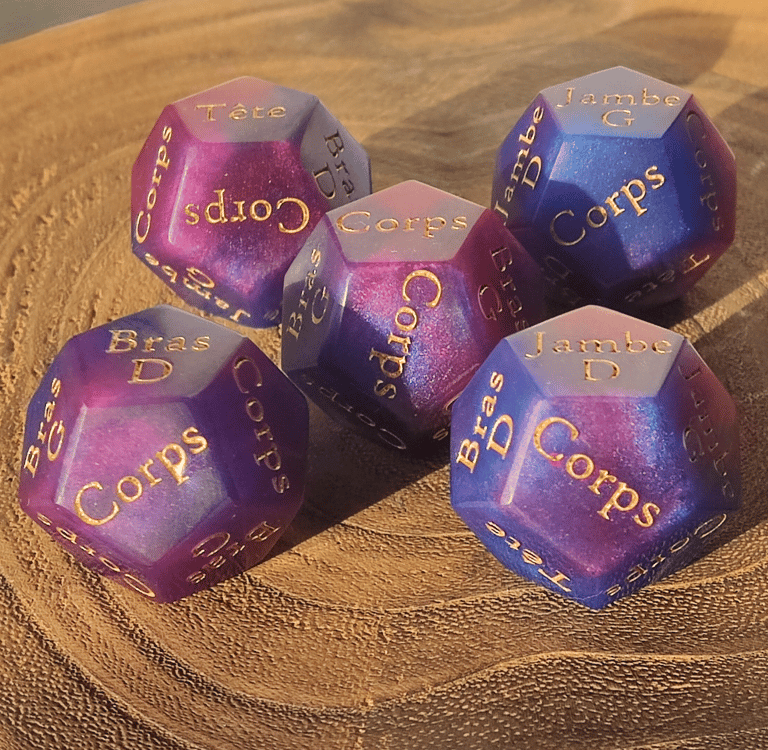 Les dés que nous avons créés sont des dés à jouer à 12 faces ainsi qu'à 6 faces (communément appelés D12 et D6) utilisables pour les jeux de rôle et quelques jeux de plateaux. Les dés de 6 sont de grande taille et les dés de 12 sont de taille standard. Nous avons créé ces dés en résine époxy, matériau qui nous permet d’avoir des rendus variés en fonction de ce qu’il vous faut (pour ces dés, nous avons voulu un rendu pailleté mais sobre ainsi qu'un rendu mat).