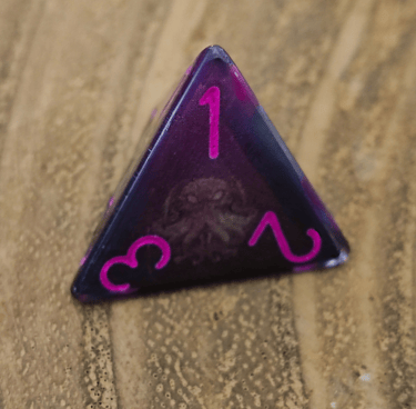 Les dés que nous avons créés sont des dés de JDR (D4, D6, D8, D10, D12, D20 et D100) utilisables pour tout type de jeu de rôle. Les dés sont de taille standard. Nous avons créé ces dés en résine époxy, matériau qui nous permet d’avoir des rendus variés en fonction de ce qu’il vous faut. Pour ces dés, nous avons voulu incruster des images de Cthulhu alors nous avons travaillé en double couche, avec une base plus petite sur laquelle nous somme venu déposer un design, puis nous l'avons recouler dans la résine pour le protéger. Nous utilisons la même méthode lors de nos ateliers de création de dés.