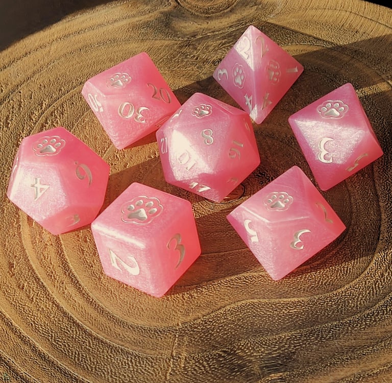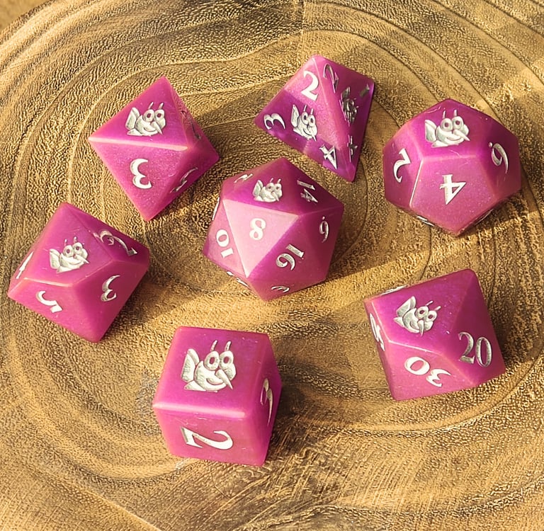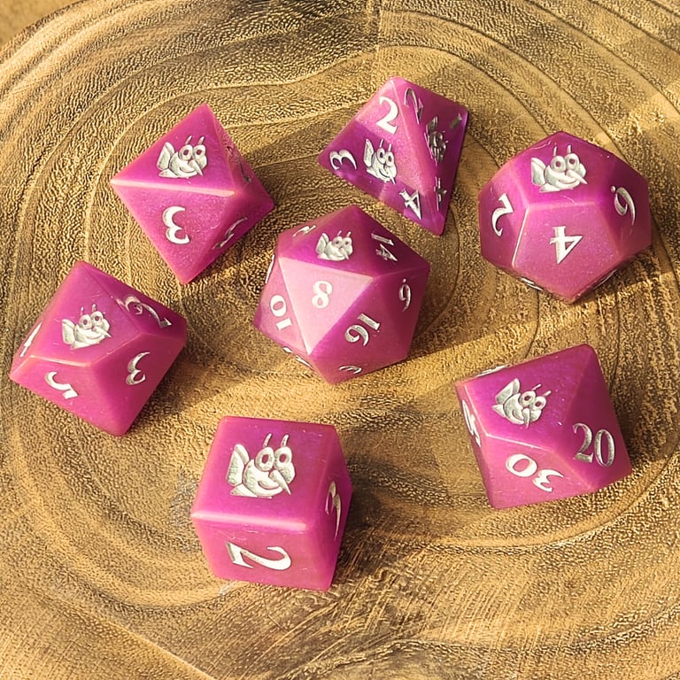 Les dés que nous avons créés sont des sets de jeu de rôle (comportant un D4, un D6, un D8, un D10, un D12, un D20 et un D100) utilisables pour les jeux de rôle. Les sets sont de grande taille. Nous avons créé ces dés en résine époxy, matériau qui nous permet d’avoir des rendus variés en fonction de ce qu’il vous faut (pour ces dés, nous avons voulu un rendu pailleté et coloré).