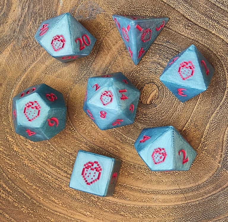 Nous créons tous nos patrons de dés sur Blender, avant de les imprimer en 3D, de réaliser nous-mêmes les moules en silicone, et de les dupliquer à la couleur de votre choix. Ensuite, nous les ponçons et les polissons individuellement, avant de peindre les chiffres (ou les logos) à la main.
