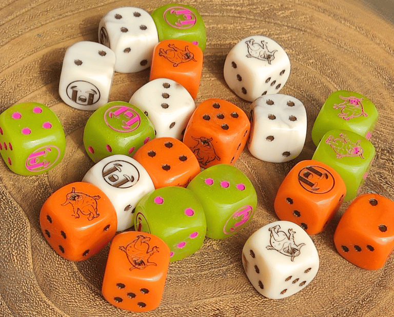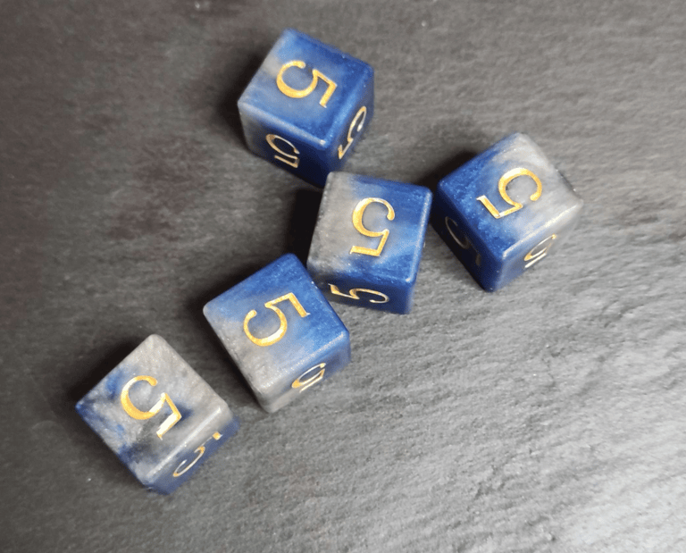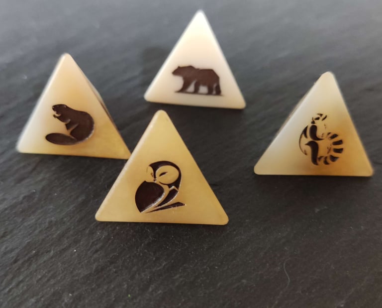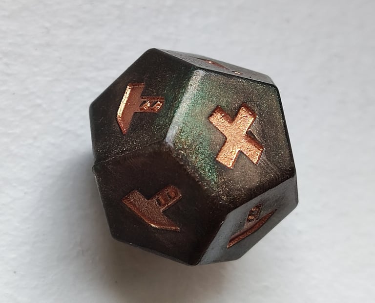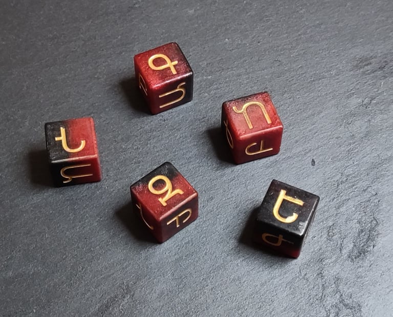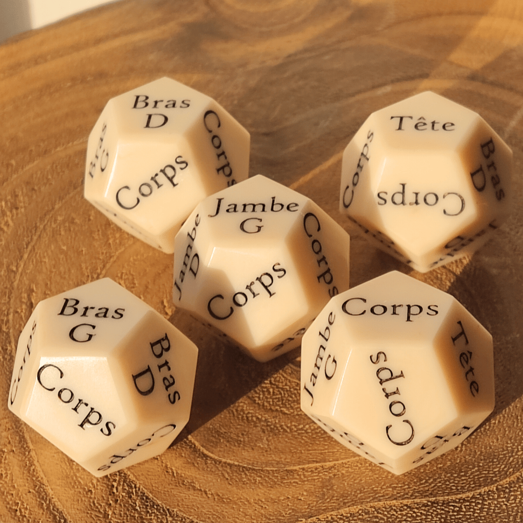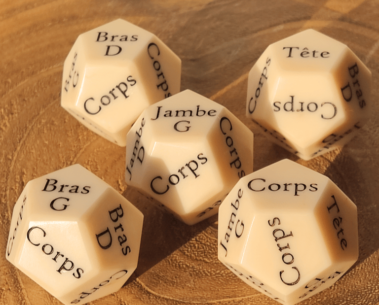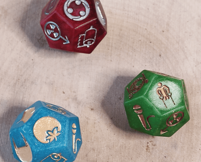 Nous faisons nous-même la modélisation 3D, l'impression 3D, la création des patrons de dés, la création des moules en silicone, la reproduction des dés, la finition (le ponçage et le polissage) et la peinture des chiffres et logos.