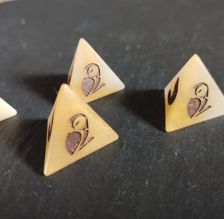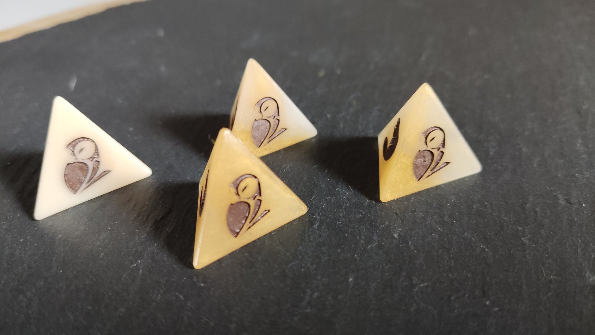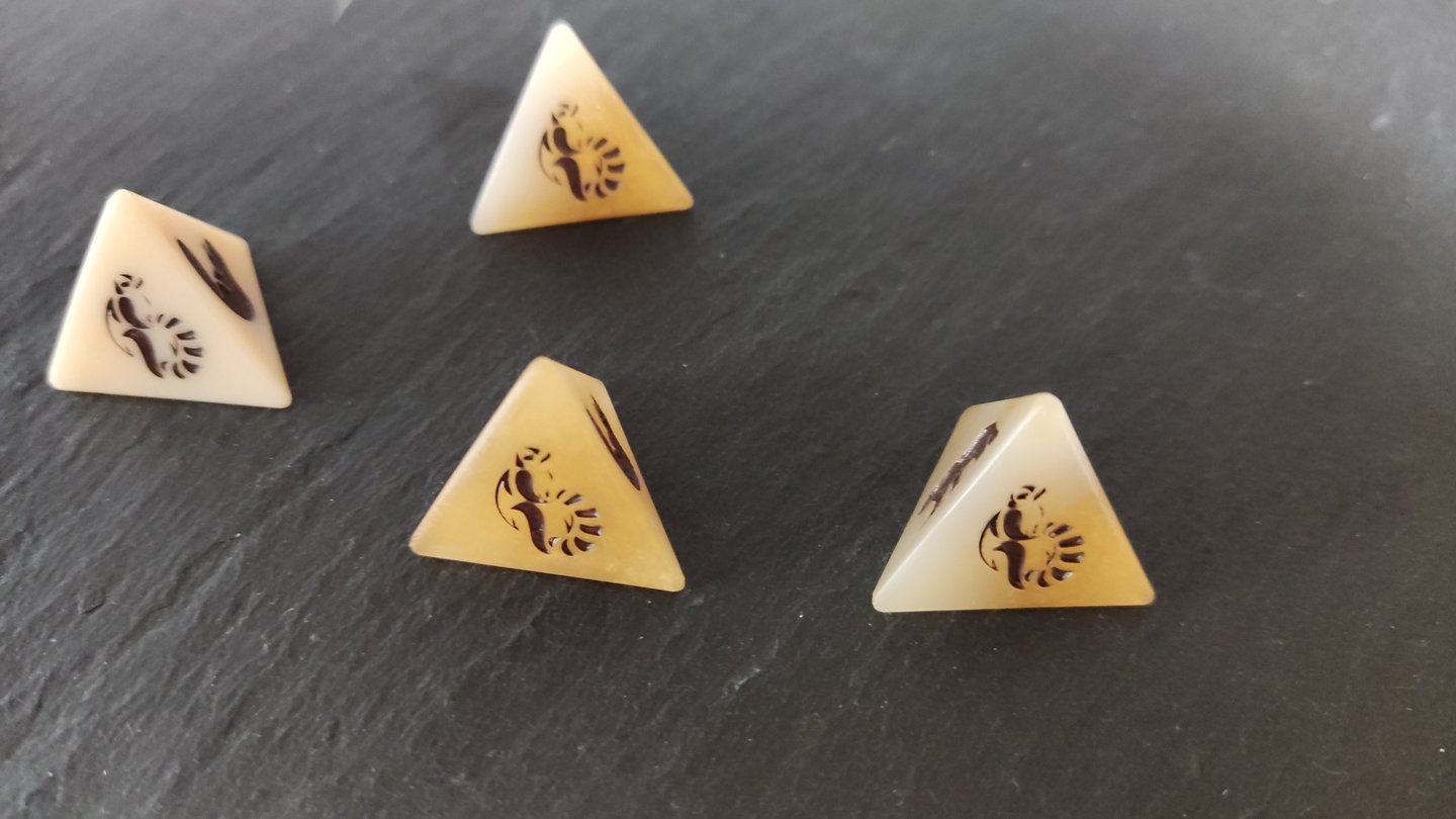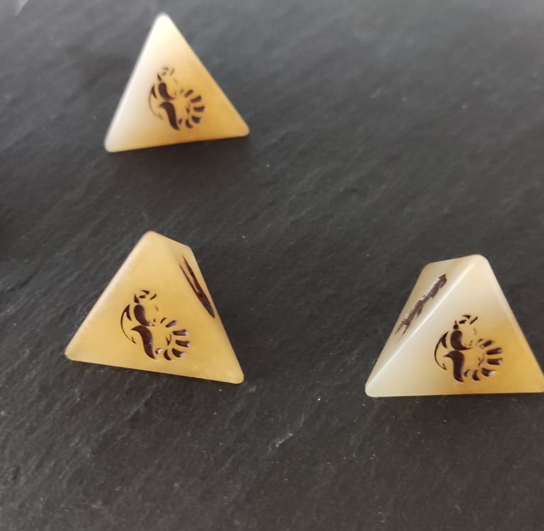 Les dés que nous avons créés sont des dés à jouer à 4 faces (communément appelés D4) et sont de taille standard. Nous avons créé ces dés en résine époxy, matériau qui nous permet d’avoir des rendus variés en fonction de ce qu’il vous faut (ici, nous avons voulu un rendu nacré).